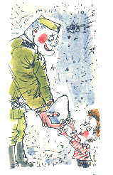 Генерал. Смирно! Разговоры с неприятелем прекратить! Итак, начинаем по сигналу... (Ходит по позиции.) Что я вижу? У неприятеля наши секретные снаряды? Измена, понятно. Придется доложить. (Превращается в Премьера.)